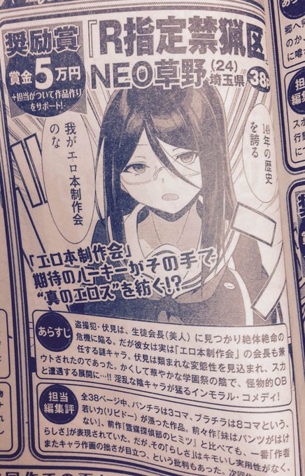 第38回少年シリウス新人賞(講談社)にて、『R指定禁猟区』という漫画が奨励賞を頂きました。