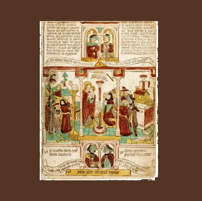 【#西洋の木版画展 作品紹介2『貧者の聖書』】出品作のなかでも古い作品のひとつで、元は40図からなる書物の1頁。絵と文字は同じ版木で彫られています。ページ全体が一枚の木版画なのです。棒などで紙の裏面からきつく擦って刷るため紙に強い凹凸がつくのが特徴で、片面にしか印刷できません。