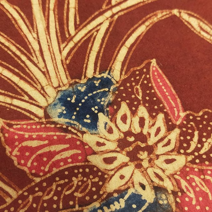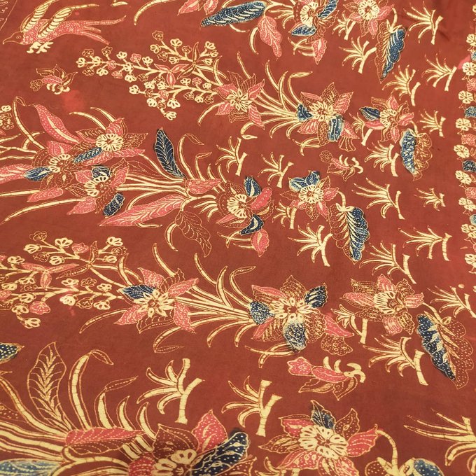 こちらの手紡ぎ糸から織られてろうけつ染めされたバティック古布は、やはりTubanのものでした😊 Tubanでこんな色は珍しいです。販売中の古布です #古布 #バティック #ろうけつ染め #ジャワ更紗 #インドネシア更紗 #更紗 #トゥバン #東ジャワ
