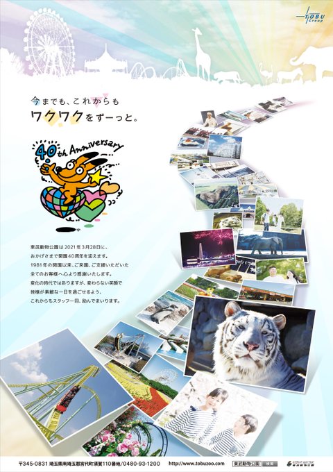 東武動物公園は、2021年3月28日に 開園40周年を迎えます 。 開園以来、ご来園いただいた多くのお客様のご愛顧と 、ご支援 くださるすべての皆様のご理解、ご協力によるものと深く感謝いたします。
