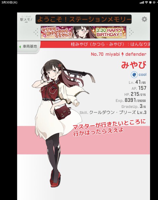 今日令和3年3月30日は位置ゲーム駅メモのでんこダブル誕生日。1人目は桂みやびさん。はんなり清楚な大和撫子系でんこ、たまに素が出るらしい。 衣装も大人な感じ、誕生日おめでとう。 #駅メモ #桂みやび生誕祭
