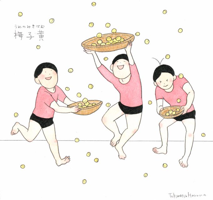 梅の実が黄色く熟してくるころ。梅雨とともに旬を迎えます。木から落ちてくる梅を楽しそうにあつめてますね。