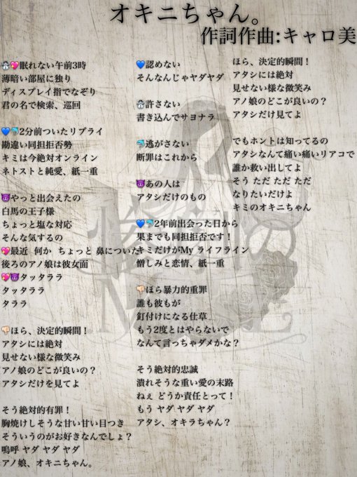 https://t.co/wd14nZUDDoにて行われた泣き虫☔︎とのコラボコンテスト大賞作品「マモノノスミカ」をベースにした「歌詞画像」第二弾公開👀