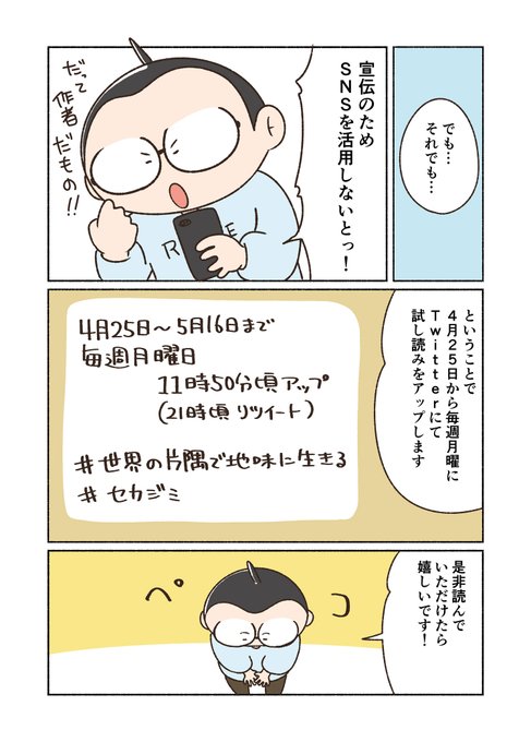 来週月曜日から「世界の片隅で地味に生きる」の試し読みを毎週アップするよっていう告知漫画。