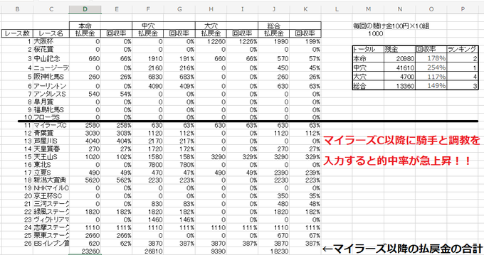 @ch72109027 提案ですが、的中競馬塾の予想家を本命か中穴に変更して騎手と調教のデータを入力し、5頭ワイドボックス予想にしませんか。私はそれで的中率が急上昇しました。(右上の回収率は合計を含んだ間違った数値です)。詳しくは『的中競馬塾 予想家ランキング』というTwitterアカウントで毎週アップしてます