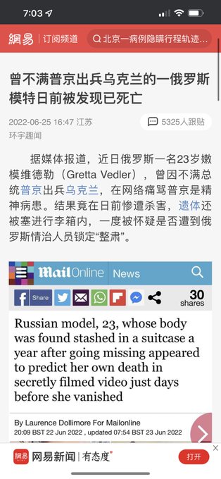 俄罗斯23岁模特(Gretta Vedler)曾公开痛批俄罗斯总统普丁是“精神病患者”,近期被发现已遇害,遗体被塞进行李箱里。怀疑被“情治”人员“整肃”。