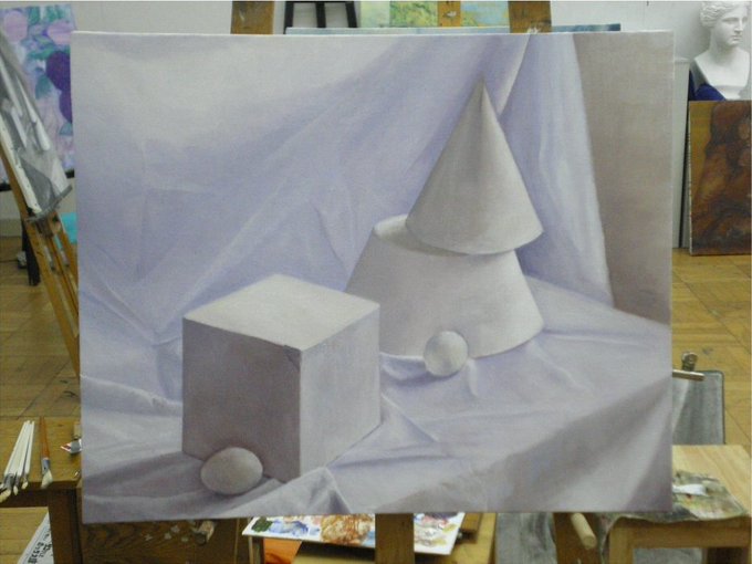 静物画は油画で、白+3色を使って見たものを表現する授業のものです