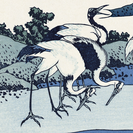 明後日は #成人の日。新成人の皆さん、おめでとうございます! #北斎 の代表作「富嶽三十六景」より、#富士山 に #鶴 と大変縁起の良い「相州梅沢庄」を。#藍摺り の風景には薄紅の雲がたなびき、鶴も7羽でラッキーセブン♪ 皆様の洋々たる前途に、幸多きことを心よりお祈りいたします。