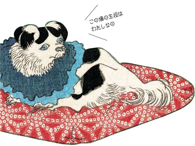 正月に琴や三味線などを演奏する弾き初めの様子を描いた浮世絵。武家の姫君の前で琴を演奏する人物を、神妙な面持ちで見つめるのは犬の狆(ちん)。姫君のお気に入りなのでしょうか。フリルのついた首輪でおめかし、座布団の上に座り演奏に耳を傾けているようです。