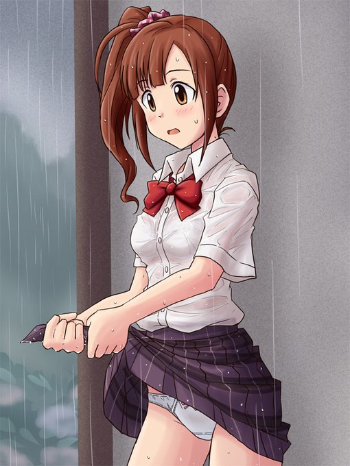 (High school girl squeezing her wet skirt)