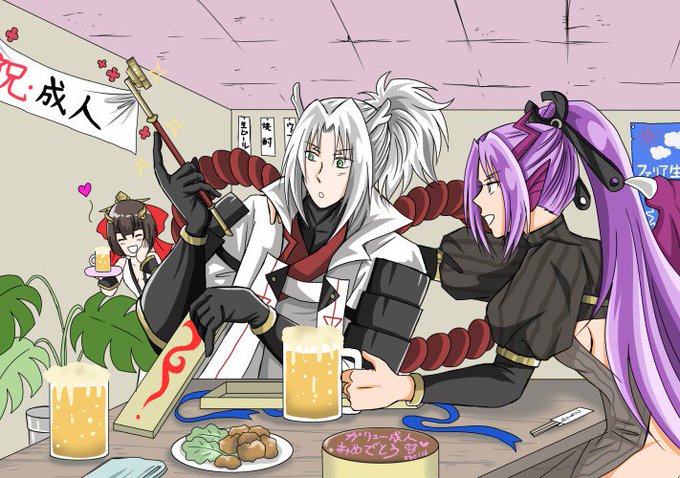 ガリュさんの煙管は、成人のお祝いにレイアさんが贈った物らしいですね。きっとお酒も・・・ということでお題「成人」。改めて成人を迎えた皆様おめでとうございます! #燐光のレムリアお絵描き会