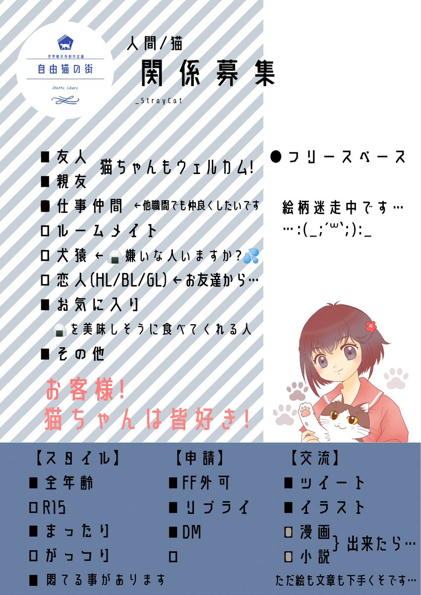 事前で時々ご飯をくれる優しいお姉さんがいますが、その他の関係は真っ白ですので遊んでいただけると嬉しいです!よろしくお願いいたします✨🙇
