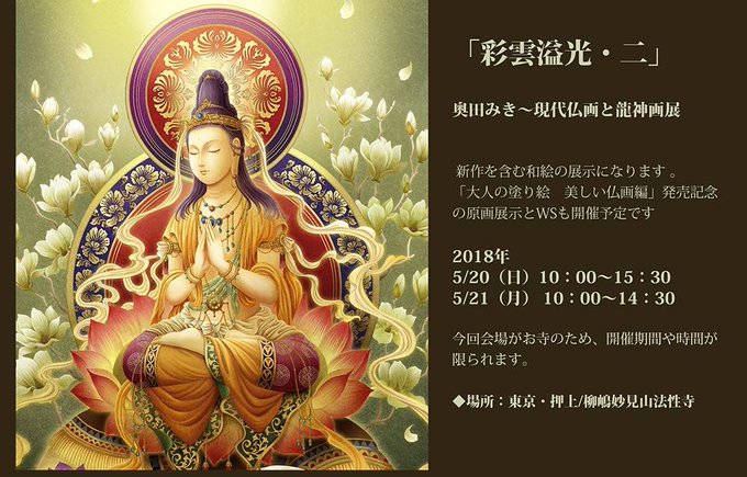 正式なDMはまだですが、仮告知画像です。「彩雲溢光・二」奥田みき~現代仏画と龍神画展 (西洋物の個展は11月です)。 「大人の塗り絵 美しい仏画編」発売記念の原画展示とWSも開催予定です。2018年5/20(日)10:00~15:30 5/21(月) 10:00~14:30場所:東京・押上/柳嶋妙見山法性寺