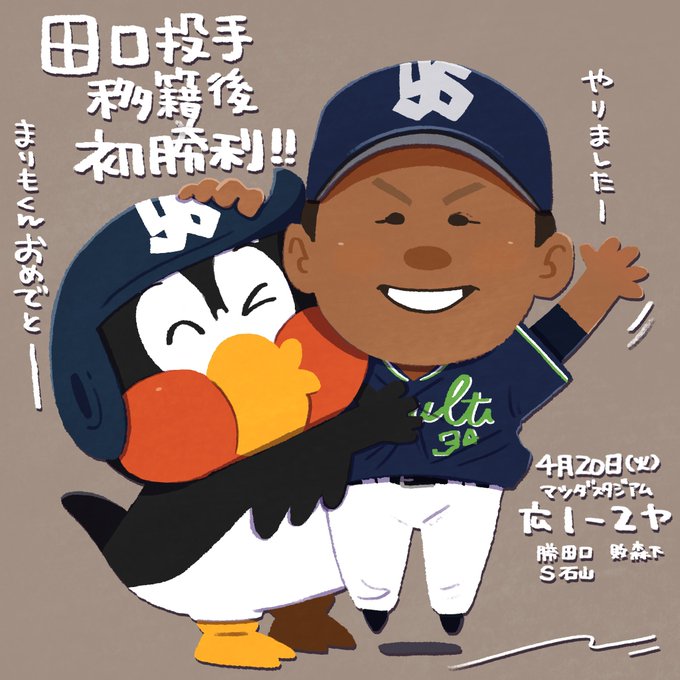 【すわほーイラスト】4月20日(火)田口投手がスワローズ移籍後初勝利‼️再び貯金1になったぞ⚾︎すわほー☂️✨