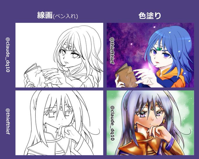 由莉奈さん(@claude_dq10)と線画交換させていただきました!同じリンジャーラでもぜんぜん違う色になってすごい。髪の色がうつくしすぎる~~!ありがとうございましたー!