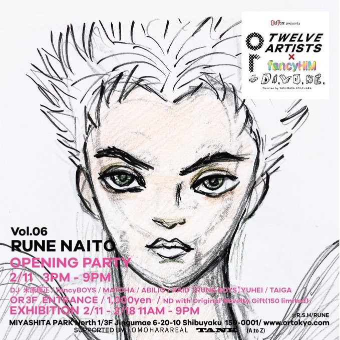 2/11-18 MIYASHITA PARK「OR」にてルネの男性画のアートイベントを開催🥀 キュレーターは米原康正さん😃 初日にはオープニングパーティも。