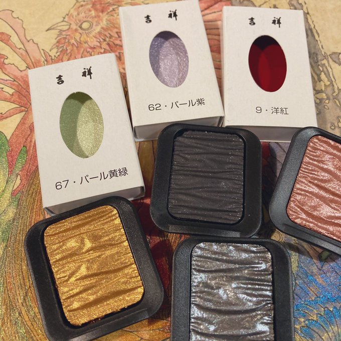 画箋堂さんの日本画大作戦、土曜と今日月曜お昼に岩絵具お試しさせて頂きました!!粒子感が味わい深い!!恥ずかしながら初めての岩絵具です…!