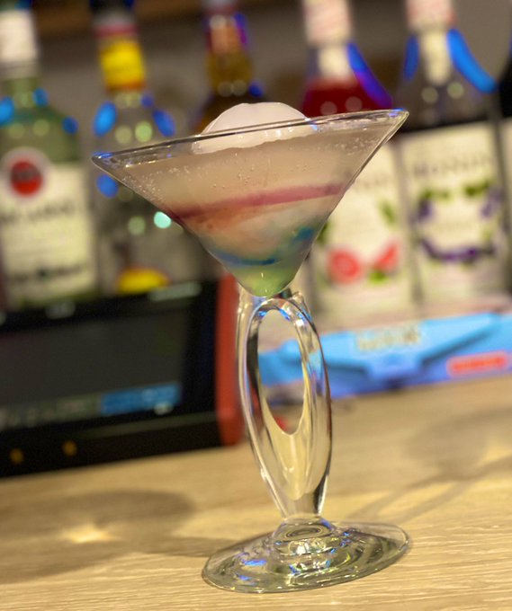 パイナップル、ブルー、巨峰、桜のシロップを重ねて一気に真上から入れるので