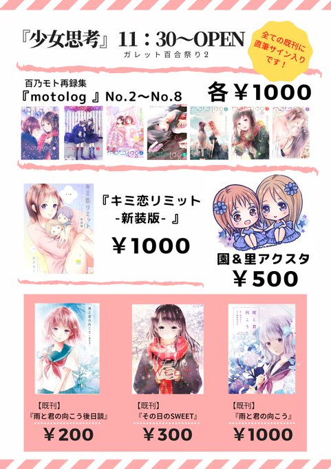 こちら3/20百合祭りのお品書きになります。既刊には全て文字サインを入れさせていただいてます🖋️会場直後はスタッフとしてバタバタしているのでうちのスペースは11時半以降OPEN予定ですー!百合祭り後は当分イベント参加予定がないのでこの機会に是非遊びにきていただけると嬉しいです~!☺️