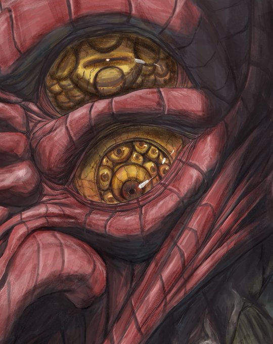 今回のデザインは左半分が原曲版、右半分がアニメ版となっています。目と目の周りの痣で例の花を作ってるのがオキニ。