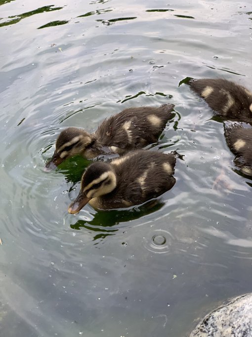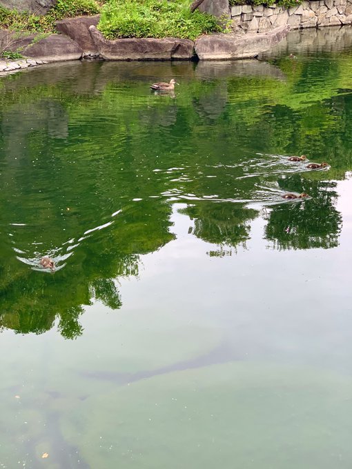 数組のカルガモファミリーがいた🦆 春に生まれた赤ちゃんかな? ちっちゃな子ガモがたくさん♡ 親ガモの後をついて一生懸命泳ぐ様子がかわいくて、お客さんの視線を集めてました。 #自転車 #サイクリング #目白庭園 #日本庭園 #カルガモ