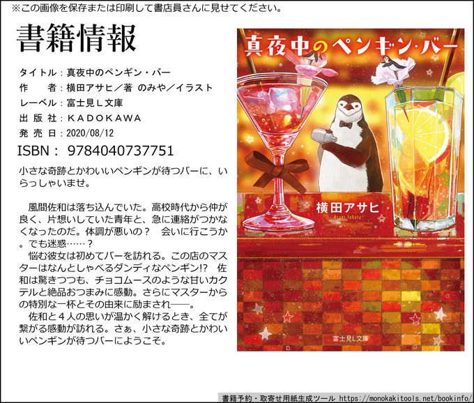【お知らせ】富士見L文庫様より2020年8月12日に発売の、横田アサヒさん/著「真夜中のペンギン・バー」の装画を担当しました。ダンディなヒゲペンギンのマスターが出てくるお話です。 URL:https://t.co/NZcymafqT0