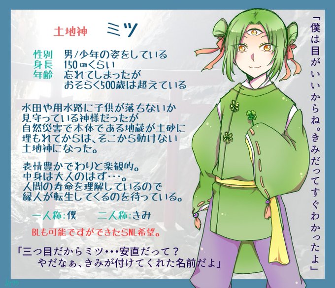 こちらの企画さまに2人目失礼します。【 @kami_n_noritoTL 】見た目が少年の三つ目の神様です。関係は真っ白です。よろしくお願いします。