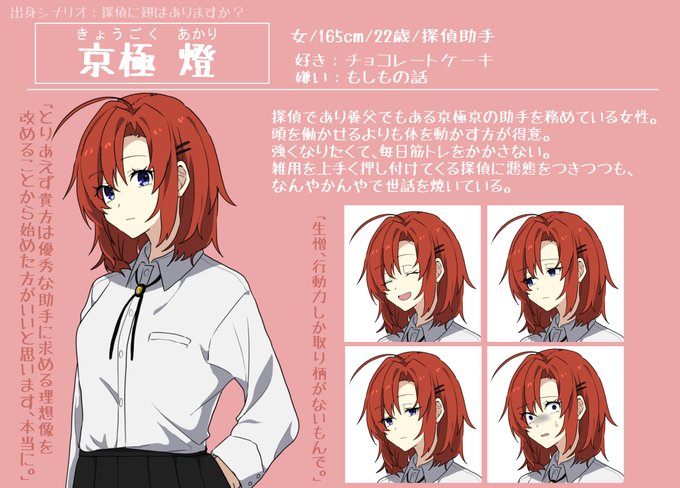 ■京極燈(きょうごくあかり) 脳筋で図太い性格の探偵助手。 雑用をうまく押し付けてくる探偵に悪態をつきつつも、なんやかんやで世話を焼いている。 #立谷TRPGメモ