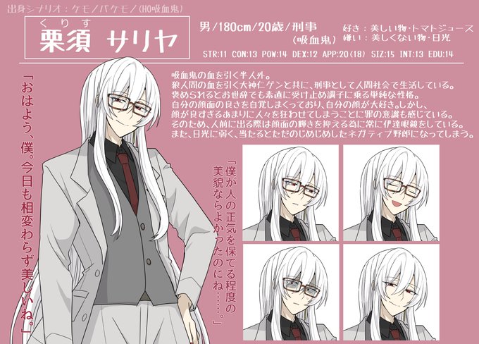 ■栗須サリヤ(くりす-さりや) 自分の顔面に対してあまりにもポジティブな吸血鬼(クォーター)の刑事。同じく半人外の相方と共に人間社会に溶け込んで暮らしている。 #立谷TRPGメモ