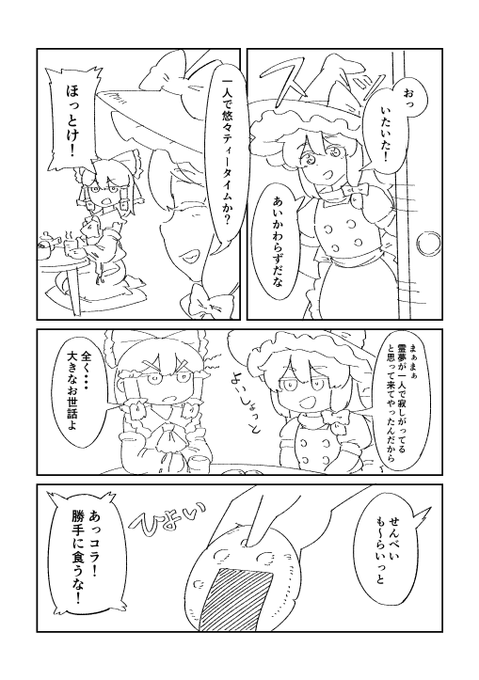 「5/5(日) 第十六回博麗神社例大祭」にて発行のへき(癖)さんの新刊『夢幻会談』にて、とりあえず表紙の3キャラが全員出る「1P」マンガ描いて参加しました。