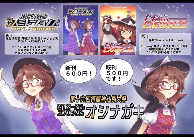 明日、5/5に開催される第十六回博麗神社例大祭のおしながきです。スペースは「お33a」、サークルは「えんどろ~る」です。