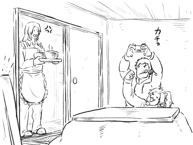 おうちで休日を満喫する慈策瑜 「きみたち、ごはんの時くらいゲームやめなさい。」
