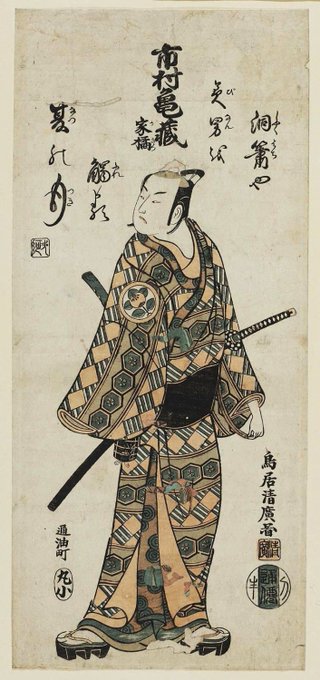 鳥居清広筆「夜の庭」 この期の細判紅摺絵には三幅対で描かれたものが多くみられますが、本図は元から二幅対で描かれているようです。主題についてはよく判っていませんが、右の女性を引き留める男の着衣には亀蔵小紋があしらわれており、その容貌は役者絵の九代目市村羽左衛門にそっくりです。