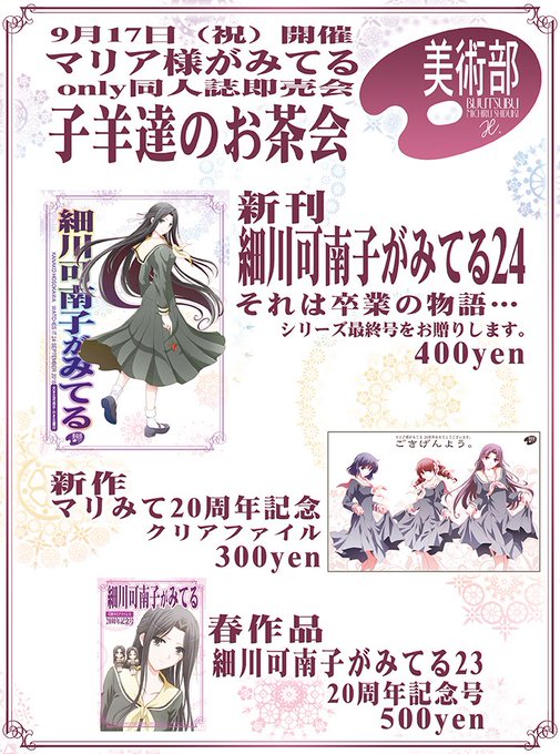 9月新刊「細川可南子がみてる24」と、子羊達のお茶会記念誌「マリミテFan」も委託します。