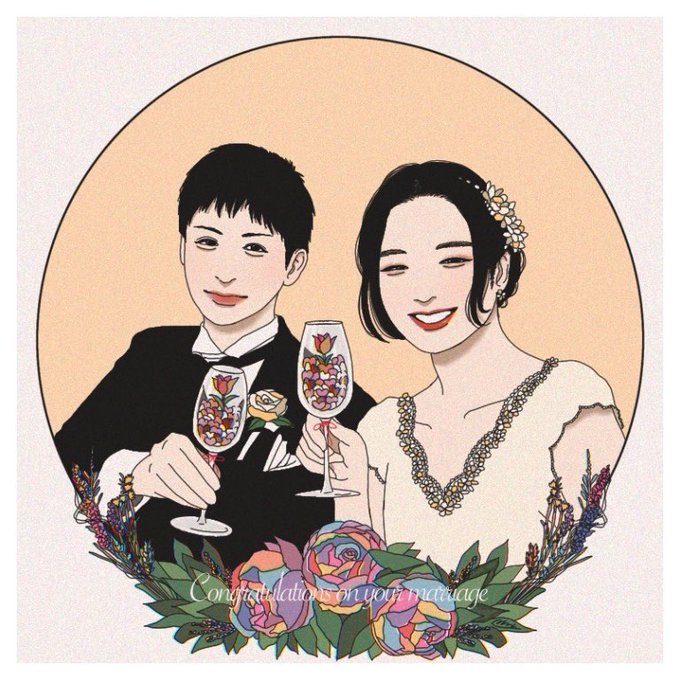 妻に結婚お祝い用(友人に報告するやつ)のイラスト描いてといわれたので、めっちゃ久しぶりにカラーイラスト描きました。久々だしいろんな合間に描いたので疲れた…