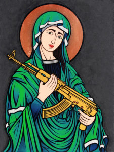 聖母マリアがアメリカ製対戦車ミサイル「ジャベリン」を抱いてる。