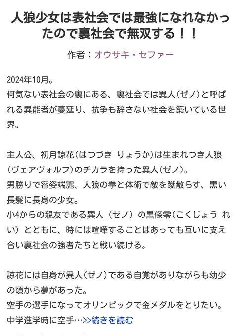 #自作の好きなところ晒す 1:処女作(2年半続けたが諸般の事情で打ち切り)のリブート。なろう生活の始まりと打ち切った贖罪の象徴 2:リブート作は処女作同様に近未来異能バトルもの。人狼少女 3:異能と裏社会要素を混ぜたストーリー。異能が表社会で当たり前の世界の逆 4:美少女&怪人の組み合わせ