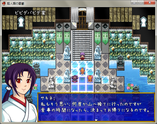 本日の成果:会話イベント用のマップ作りました。やっと巫女さんをお披露目する時がきました。立ち絵素材はキマイラの檻、キャラチップは臼井の会よりお借りました。(どちらも改変してます・・・)