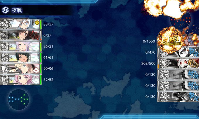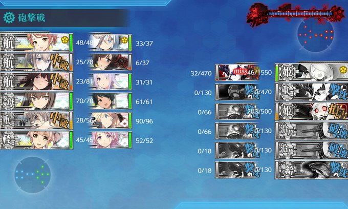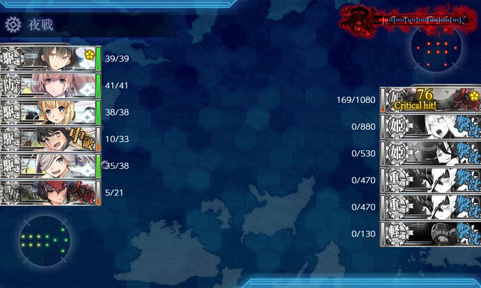 最終用編成に変えてから道中撤退が多発、ボスマスに辿り着いても連続T字不利と苦戦、三度目ボス到達も反航戦でネルソンタッチも上手く決まらずでしたが、友軍大暴れ(飛龍蒼龍→戦艦撃沈、風雲涼波→ボス大破)のおかげで最後は朝霜CI撃破