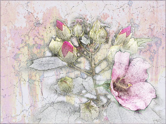 デジタル版画作品、2018年制作。近所のスーパーの横の空き地に咲いていた花を描いてみました。#デジタル版画 #ジクレープリント #デジタルプリント #版画 #鈴木朝潮 #photoshop #ペンタブレット #版画展 #アート #芸術 #美術 #花の絵 #花の版画 #版画家 #デジタル版画協会 #桜 #芙蓉の花の絵 #芙蓉の花