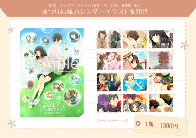 【(C19)告知】突然の告知、失礼致します! 12/30 コミックマーケット91(2日目)「東1 U19b 花煙草」様にて 数ヵ月前にご報告をいたしました、まつりんぬの個人カレンダーイラスト集を委託販売させていただける事になりました(*^▽^*)✨1冊1300円です! →