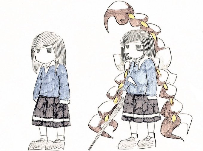 【過去絵】 通常と第一段階 完全花蠍化になるまでは防御力は跳ね上がるも本人の攻撃力が上がらない 毒を使って幻覚を見せて隙を突くか、防御力を信じて肉壁や特攻が主な戦術 防御力が上がっても痛いもんは痛いらしい