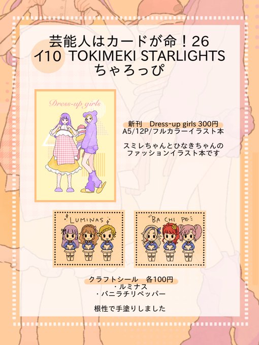 #芸カ26 の新刊はあかりちゃんとスミレちゃんのめちゃ短い(本文7p)の漫画で、二人がゆるく喋るだけの話になってます。少部数ですが既刊のイラスト本も持っていきます。よろしくね