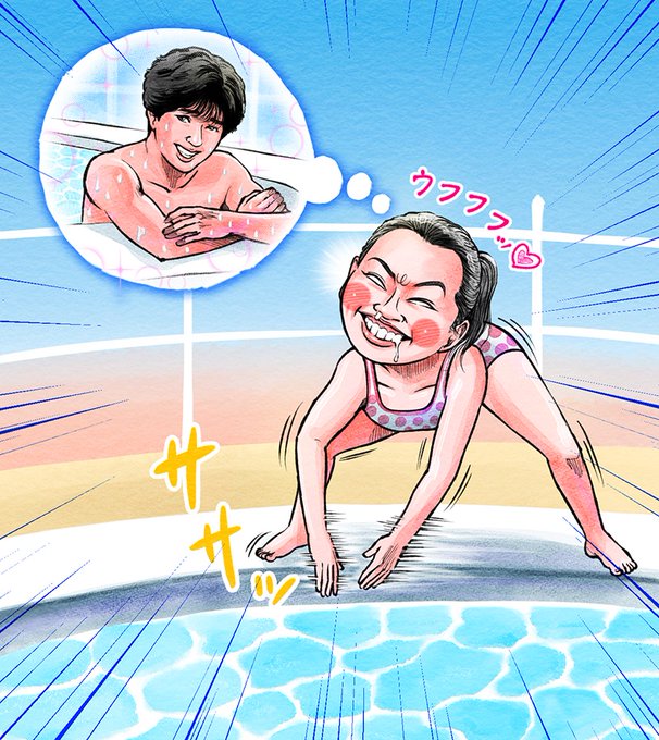 9/28に放送された「上田と女が吠える夜」SPにてイラスト描かせて頂きました。 芸能人水泳大会のマッチを思いながら大磯ロングビーチのプールのヘリを撫でるいとうあさこさん。 真面目そうなディレクターの童心に触れ恋するエルフ荒川さん。