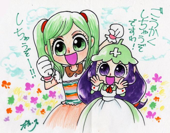 テーマの一つのカッパは、旦那の若い時に生徒からつけられていたあだ名でした。テーマのもうひとつはアマビエだったので、わたくしもカッパに寄り添いアマビエに変身~。と、言う絵です。筆のカッパの絵は、お炊きあげの寄せがきで描いた絵です。