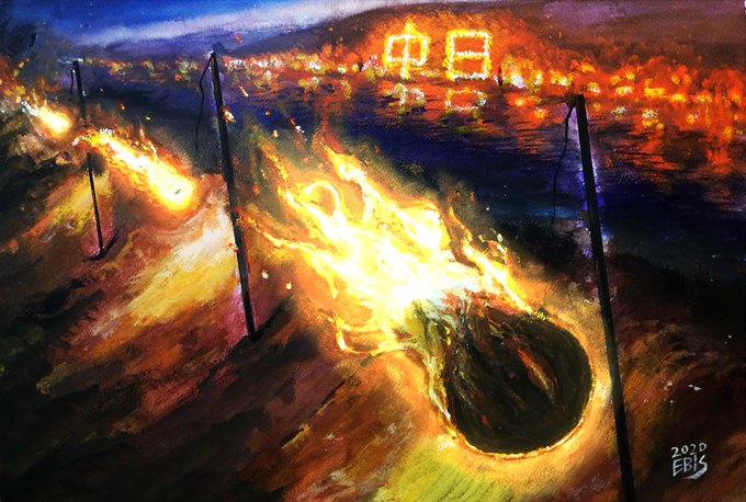 始終には『まど火』といって墓地で子供らが藁で火を焚き、霊よばいの唄をうたう。《すすきの出湯》