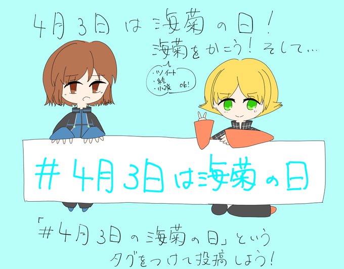 ありがたいことにタグを作ったらどうかというアドバイスをいただきました!確かにタグがあった方がみなさんの作品を見やすいので、投稿する際には「# 4月3日は海菊の日」でお願いします!みなさんの海菊待ってます!