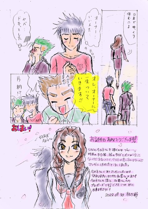AOIは移動の時、絶対スーツってルールがあるかなと思い加賀さんもシンプルなスーツに…いや、加賀さんの普段着、私には難…新条さんはとりあえず赤いシャツにAOIって描いとけ!でこうなりました(いつもゴメンナサイ… 今日子さん、27回目のお誕生日おめでとうございます! #葵今日子誕生祭2022