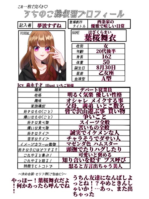 舞衣🍃は🌨の同い年の従姉妹。街のデパートで働く女性。