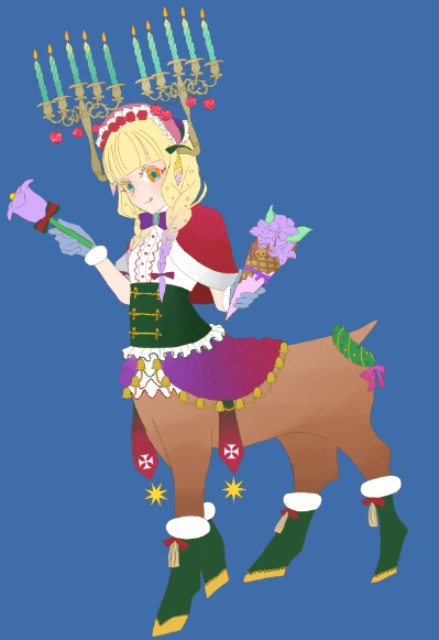 「バッファローの角が生えていて、そこに花の咲いたツタを絡めています。瞳は海色で髪はカカオ色。オレンジや檸檬を瓶に詰めてシロップ漬けにするのが趣味です」
